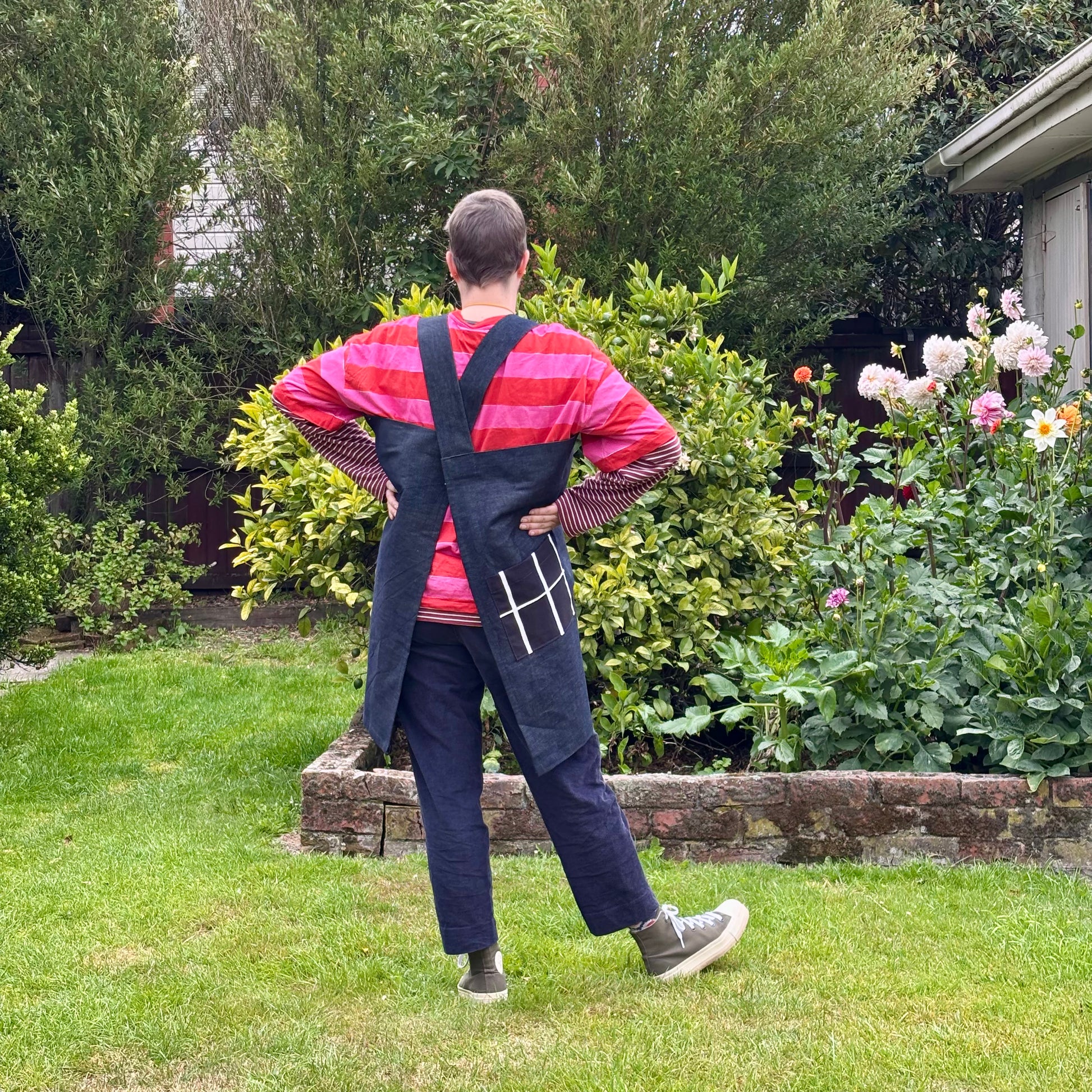 Versatile boxy apron, perfect for many activities. Cross over straps to accommodate a range of sizes and to avoid pressure on your neck. The fabric is a heavy weight 12oz denim with contrasting cotton patterned pockets.