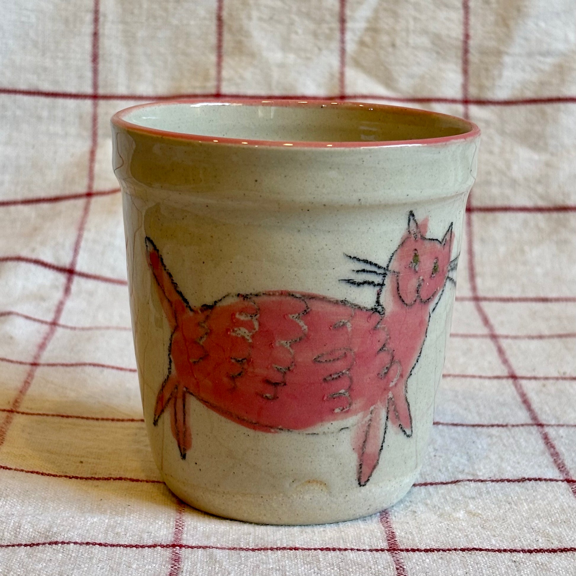 Tumblers in linen clay with hand scribbled cats. Stackable.