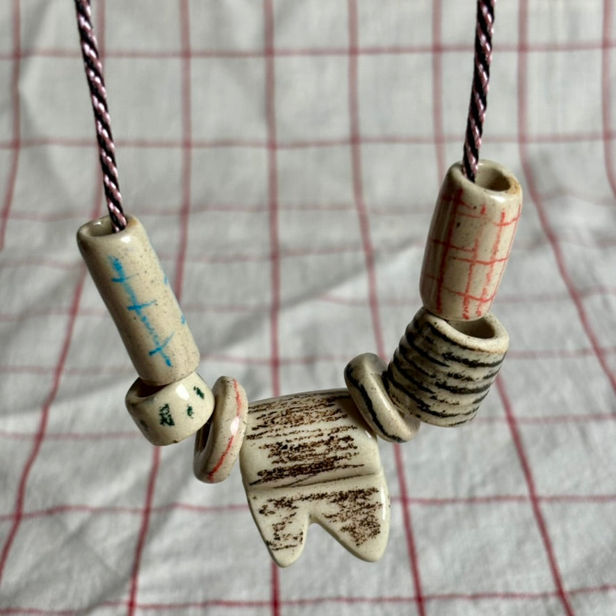 Handmade beads in linen clay with various scribbly finishes. The cord is a lovely purple and pink metallic vintage, twisted rope. Toggle at the back to adjust length and brass cord ends.
