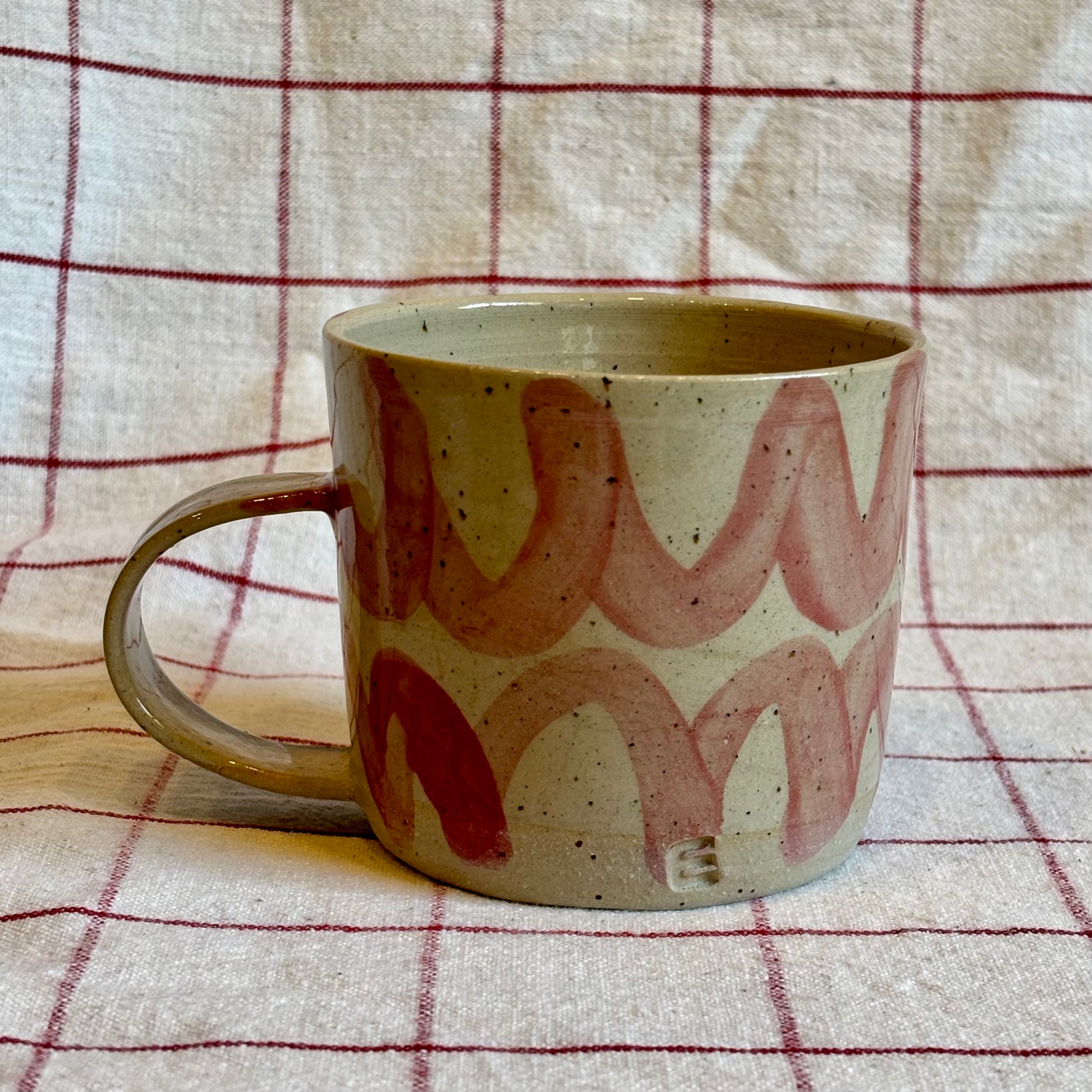 Mugs in various clay bodies with hand painted wiggle decoration.